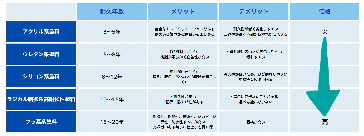 こんにちは!福岡県直方市で外壁塗装を行っている平島建装です。このページでは、「外壁塗装を考えているけど、どの塗料を選べばいいの?」という方に向けて、代表的な5種類の塗料の特徴をわかりやすくご紹介します